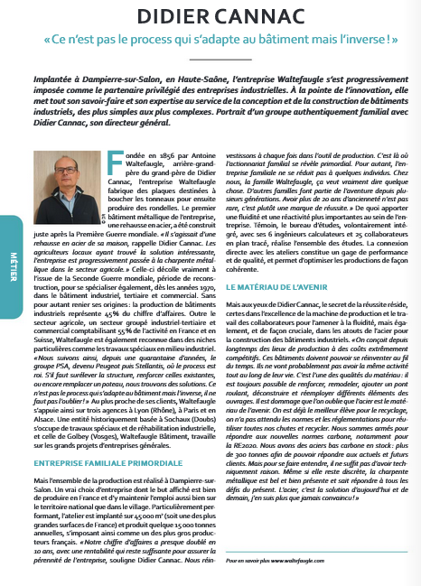 Découvrez l'article paru dans la revue INDUSTRIE(s) de CONSTRUIRACIER , où Didier CANNAC, directeur général présente WALTEFAUGLE !