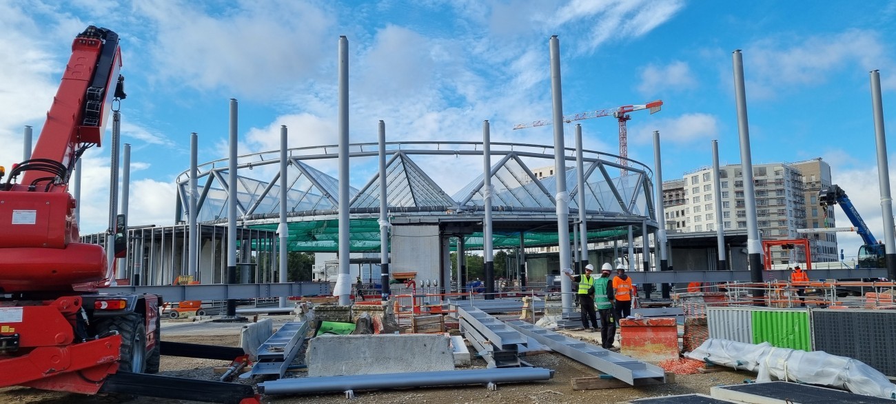 Les façadiers installent déjà leurs équipements sur les édicules montés précédemment.