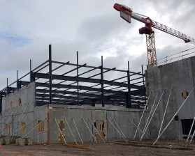 La grue à tour est prise dans un auvent reliant un premier bâtiment chevillé sur dalle béton et un second qui est cerné par trois murs, en décroché.