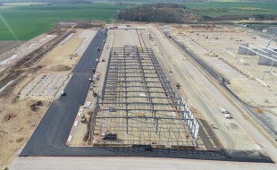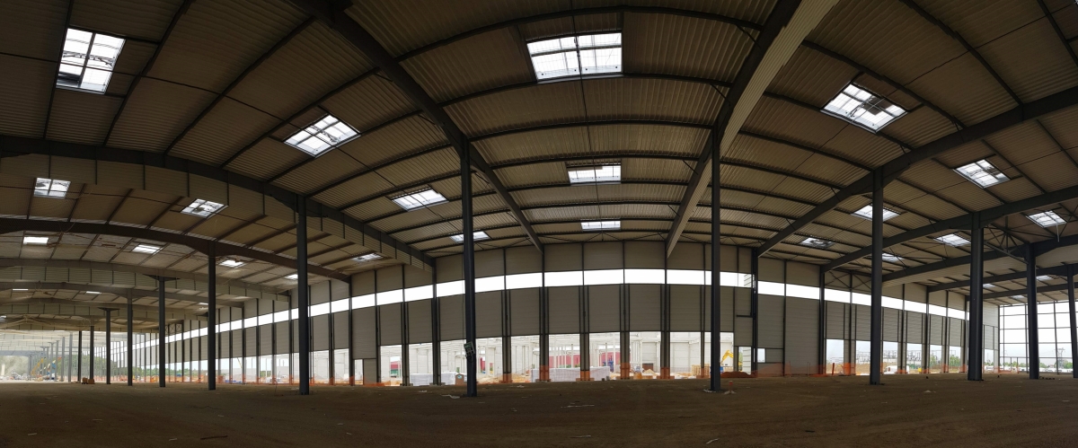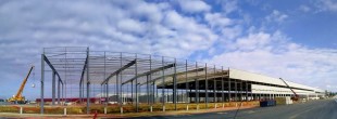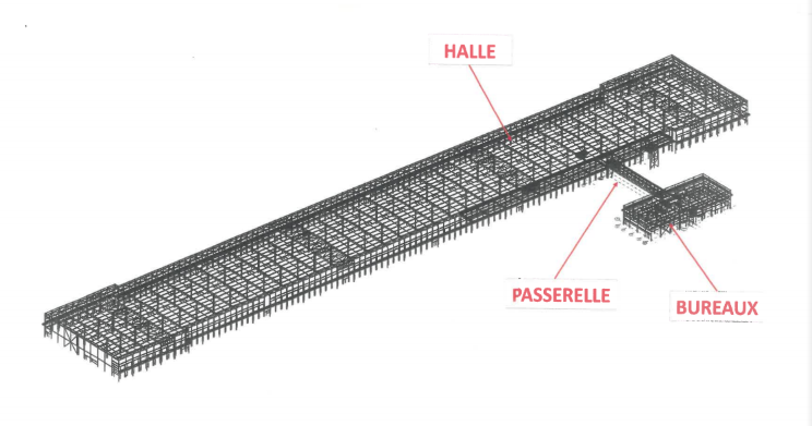 La halle, de 400.00 m de long et de 57.00 m de large, composée de 40 travées, est reliée aux bureaux par une passerelle de 40.00 m de portée, sans aucun poteau intermédiaire.