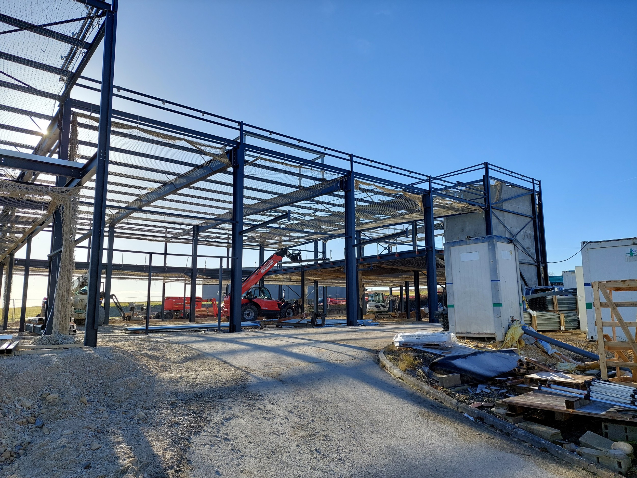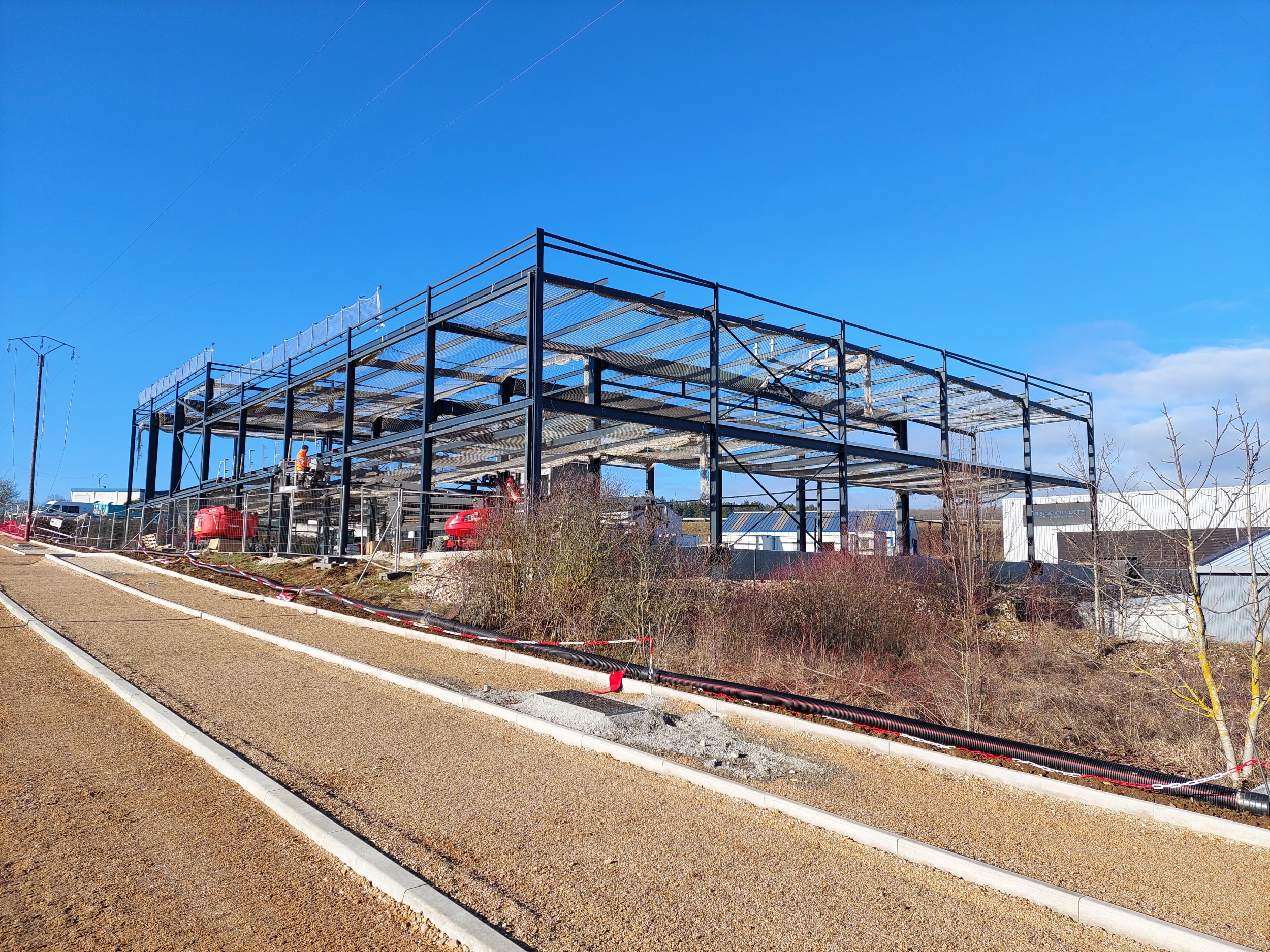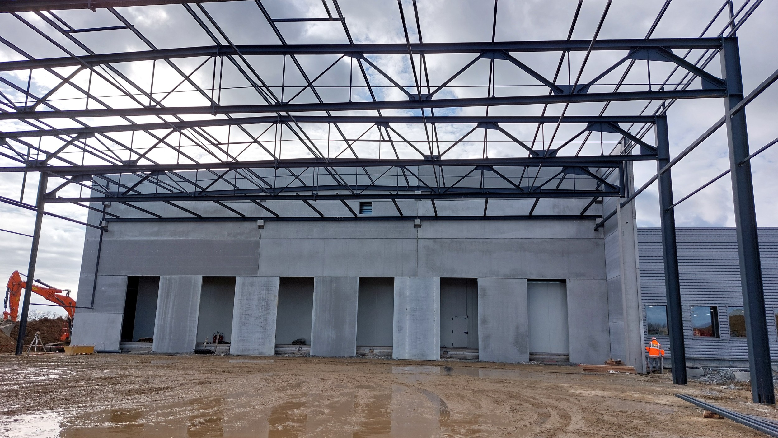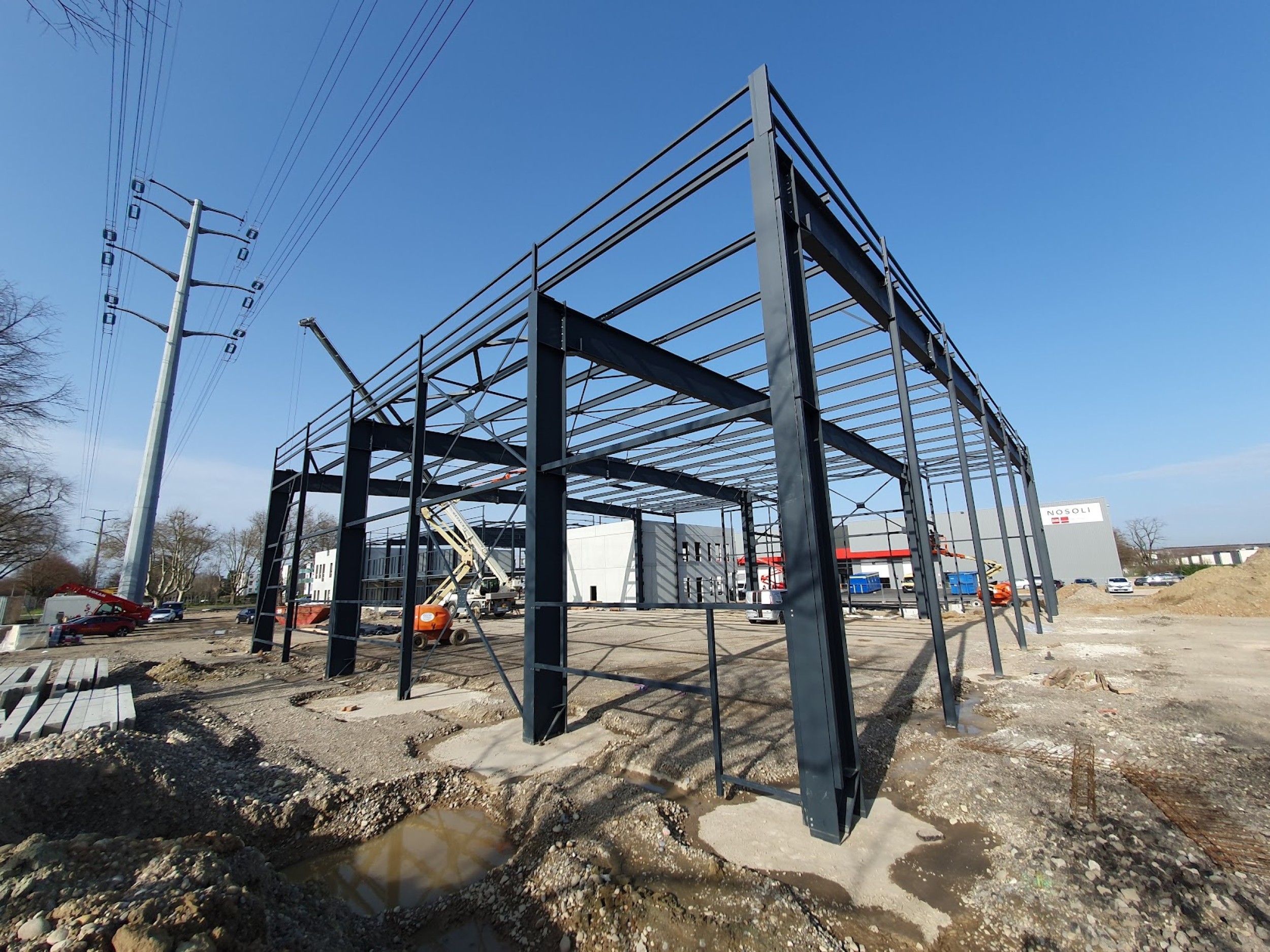 Construction d'un entrepôt logistique : Entrepôt, local de charge A (18.40 x 11.26m), local de charge B (46.92 x 6.39 et 9.38m), bureaux (23.55 x 18.60m), plancher collaborant 850m², 128 tonnes de charpente.