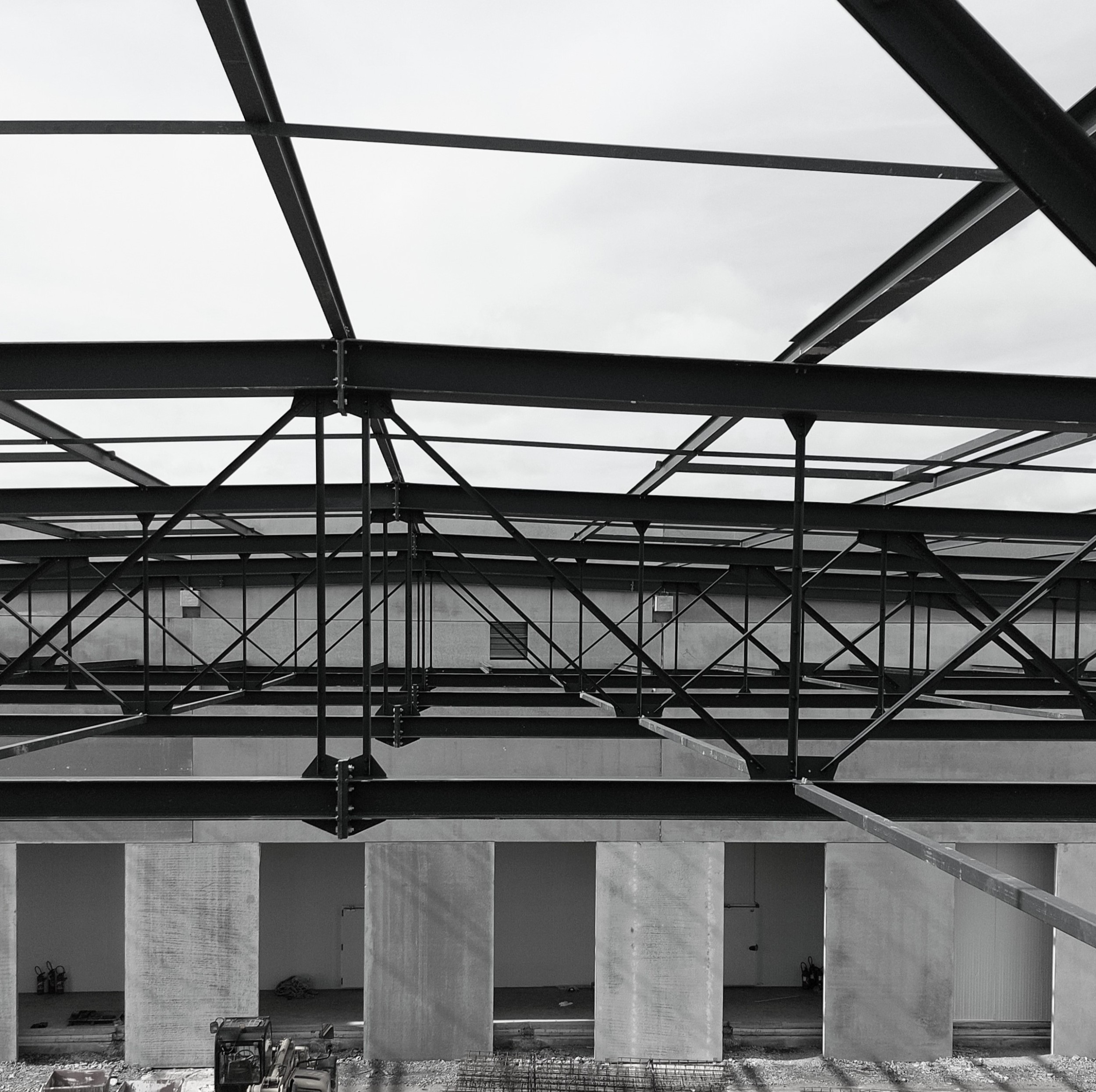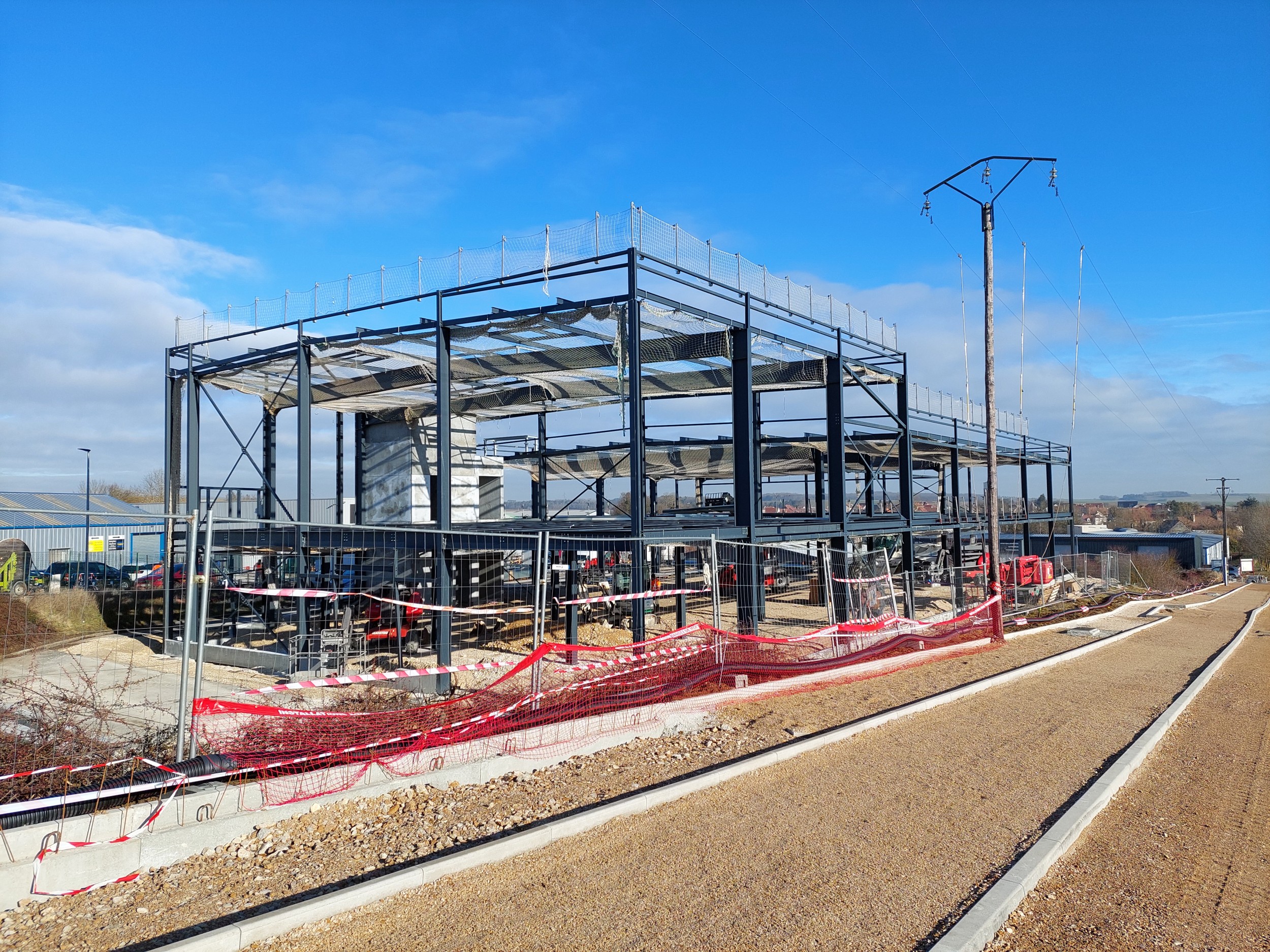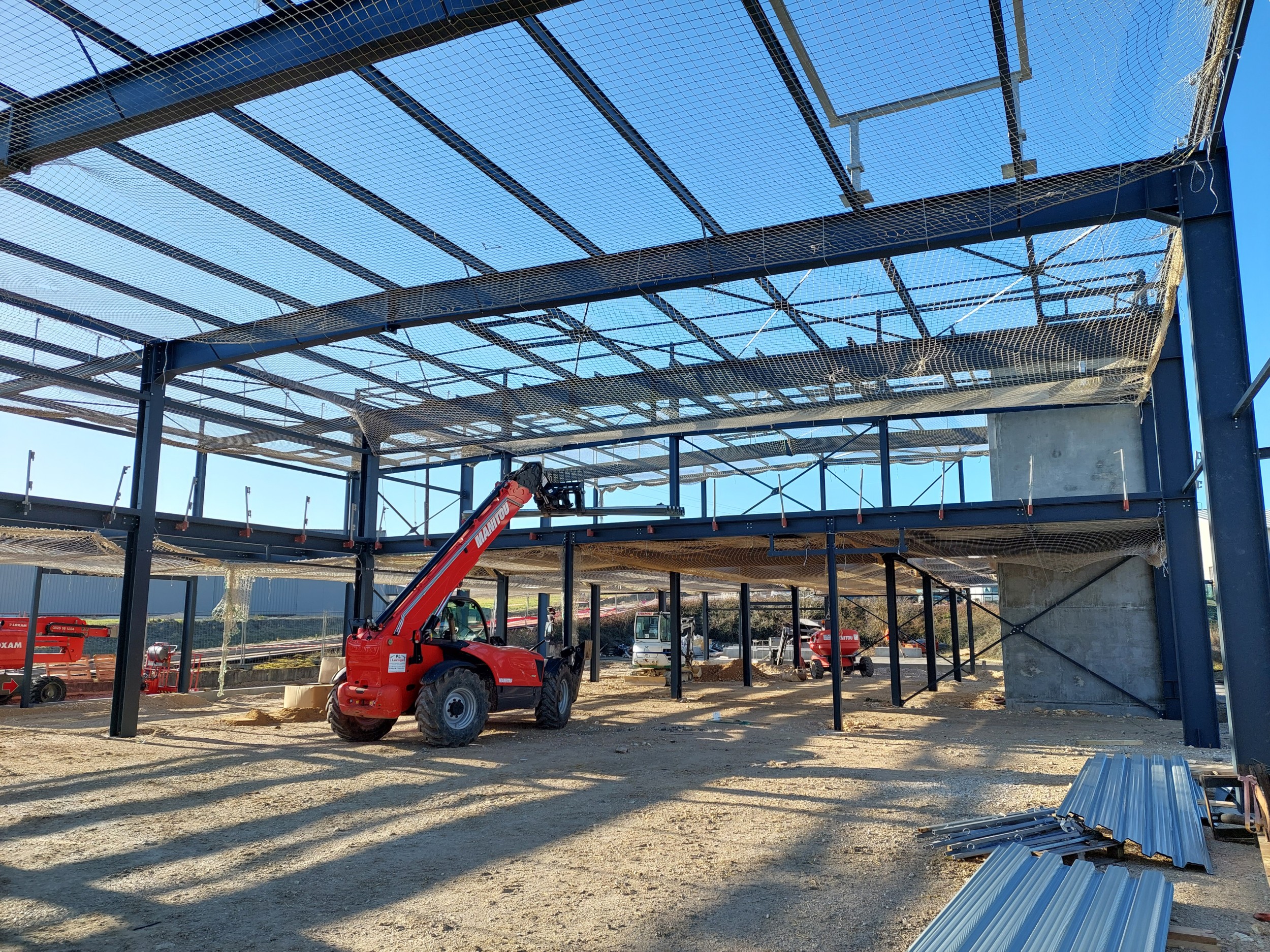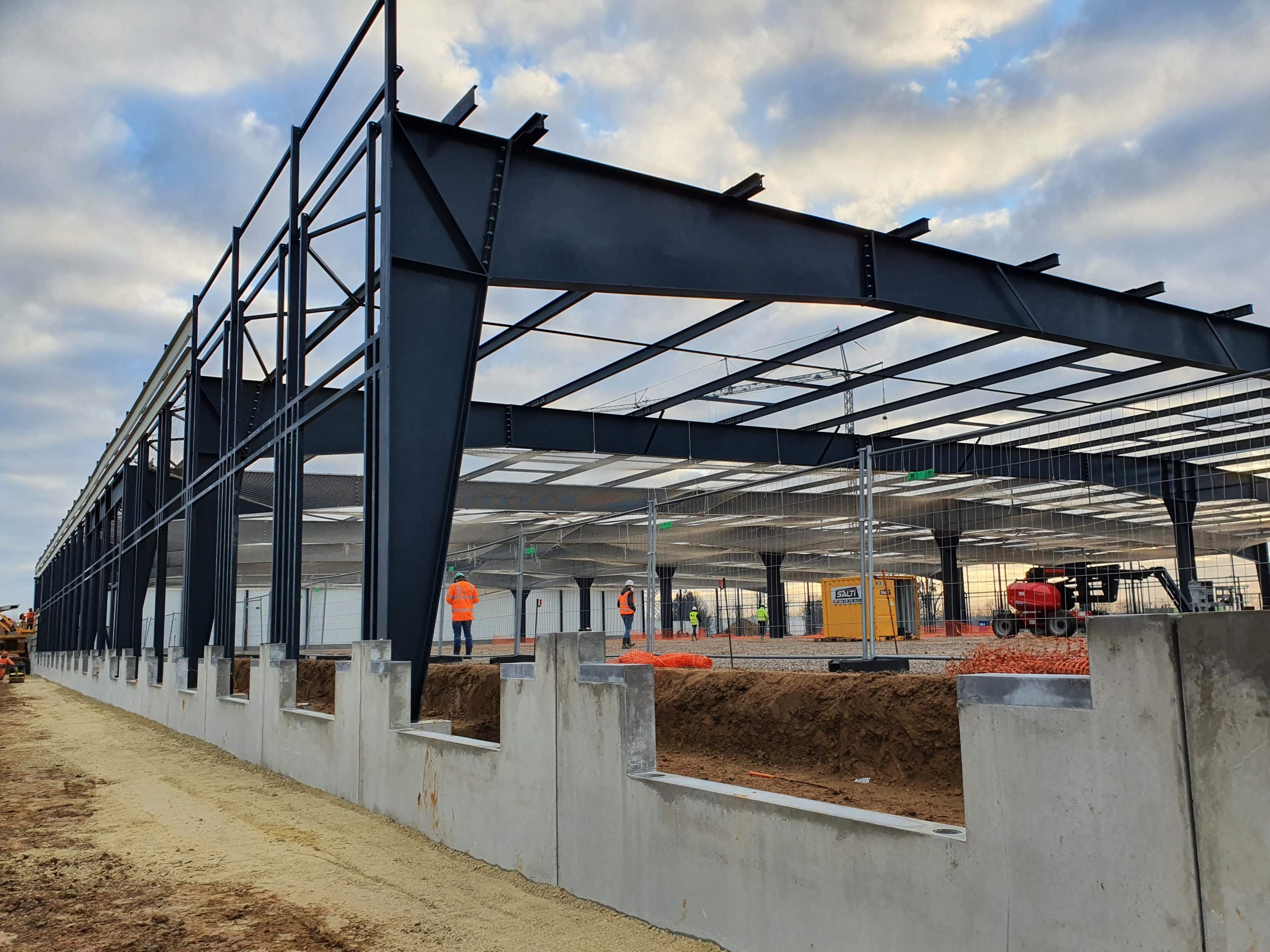 Construction d'un entrepôt logistique : Entrepôt, local de charge A (18.40 x 11.26m), local de charge B (46.92 x 6.39 et 9.38m), bureaux (23.55 x 18.60m), plancher collaborant 850m², 128 tonnes de charpente.