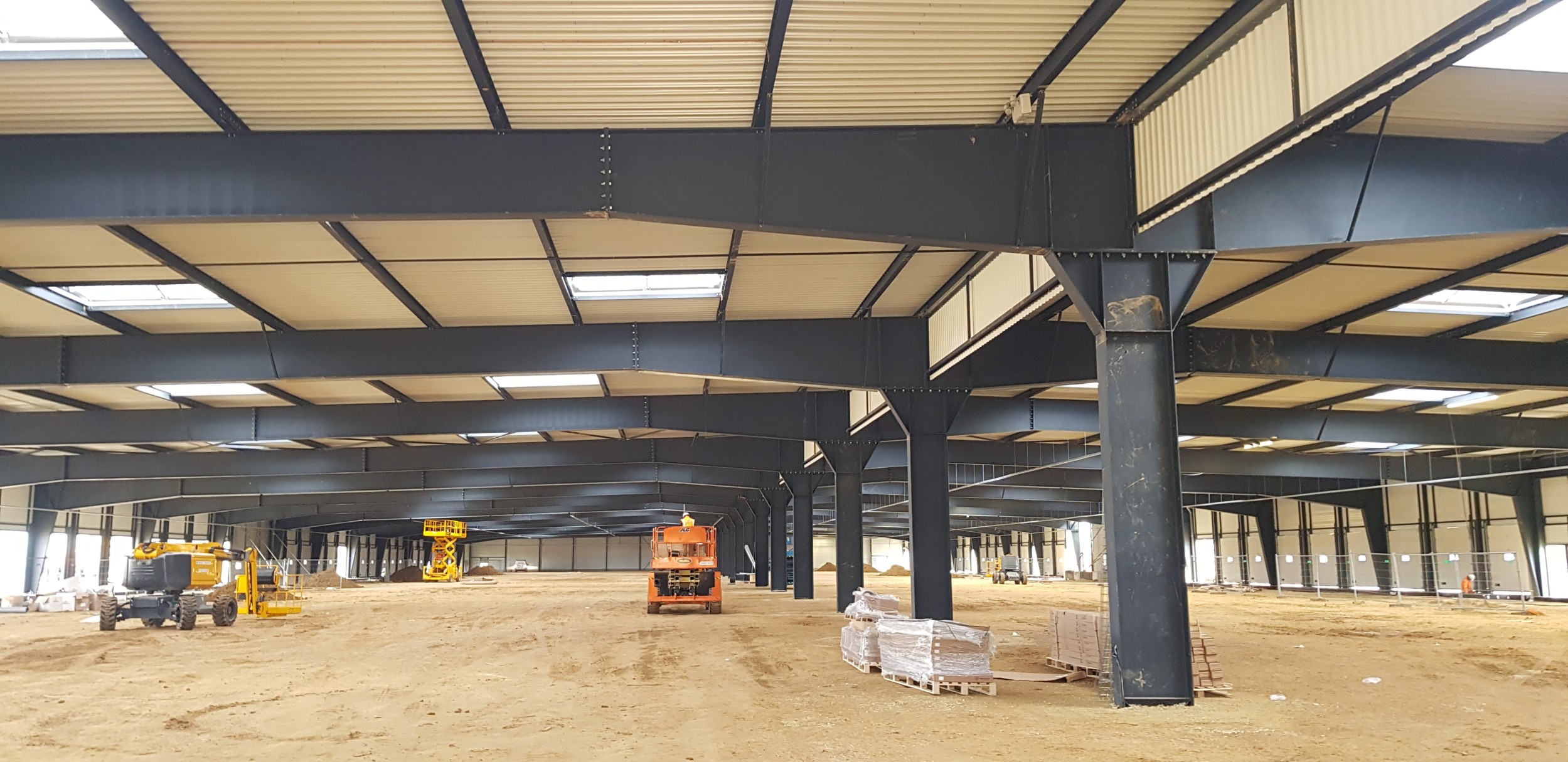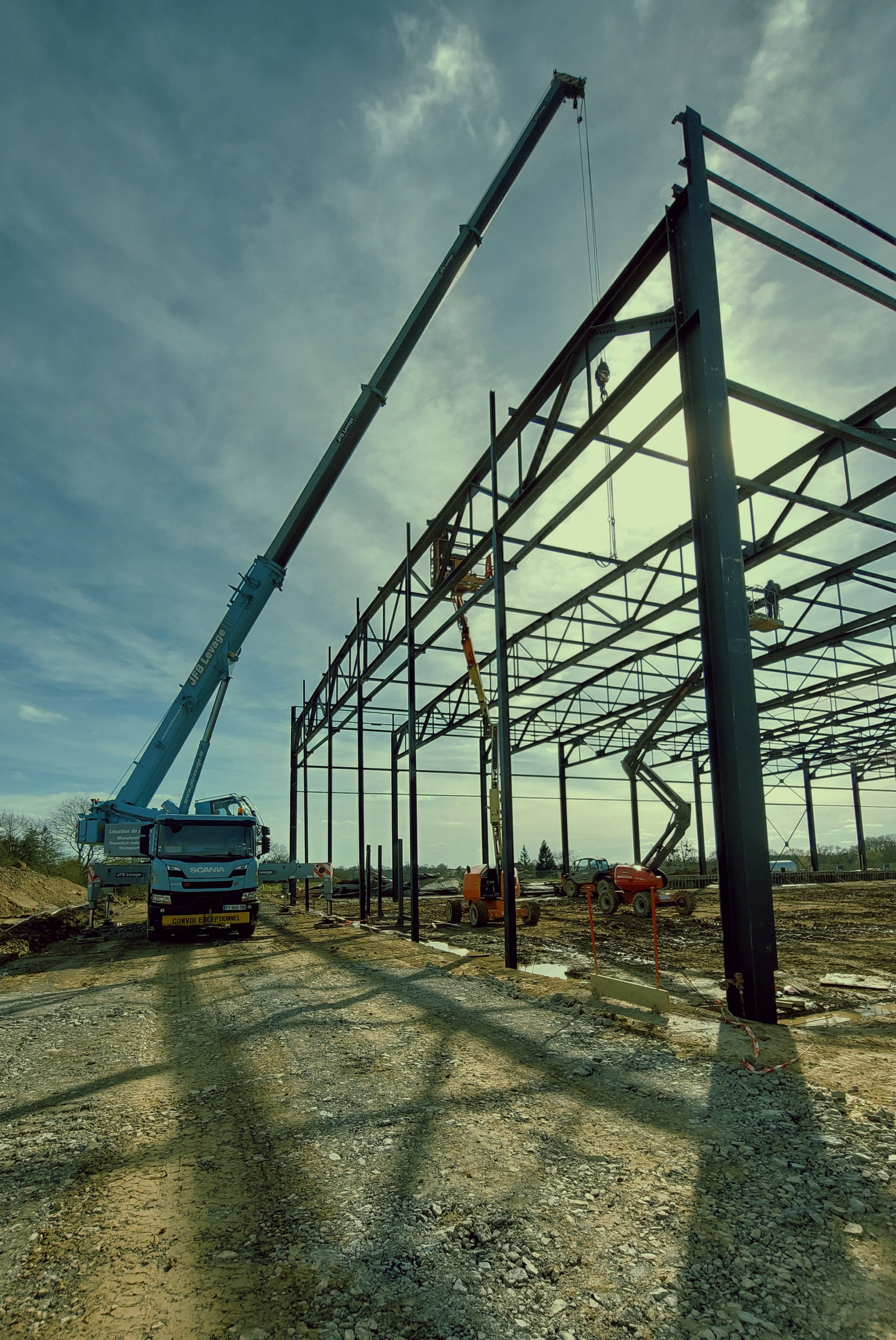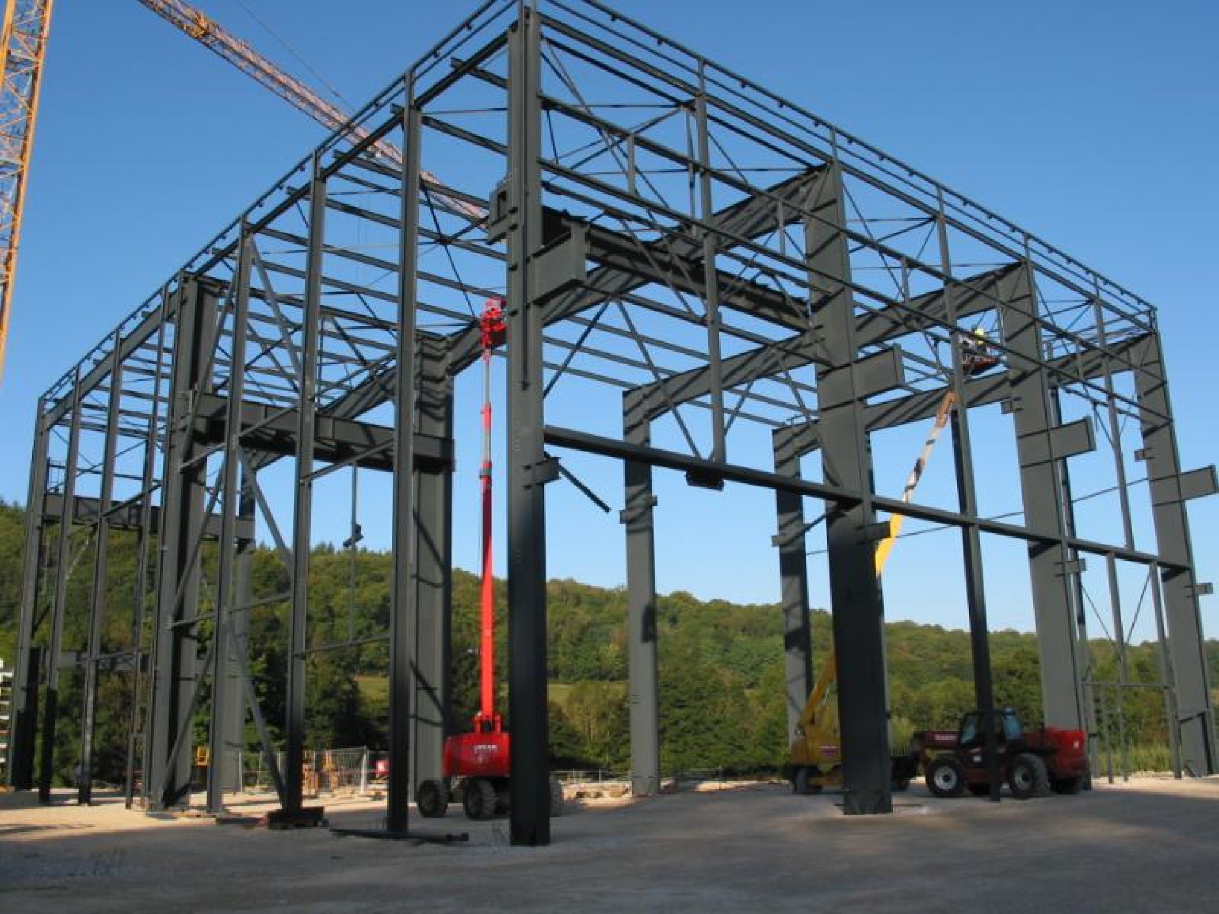 Extension d'une plateforme logistique. 4140 m², 60.00 m x 69.00 m de portée, hauteur à l'acrotère 8.70 m, 100 To de charpente
