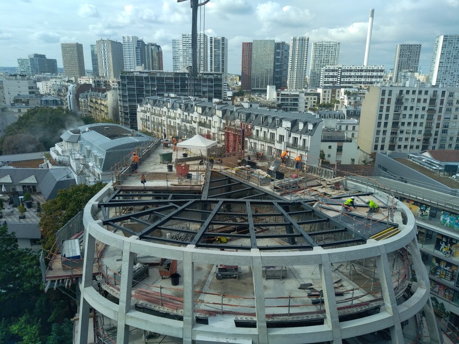 840 T d'acier en plein coeur de Paris dans un site exigu, avec le renforcement d'un bâtiment IGH de 11 étages, la ré-hausse de 3 étages d'un autre bâtiment et la construction d'un dernier bâtiment en forme de goutte d'eau / construction mixte acier / béton