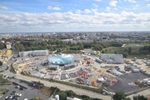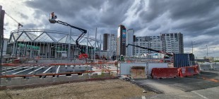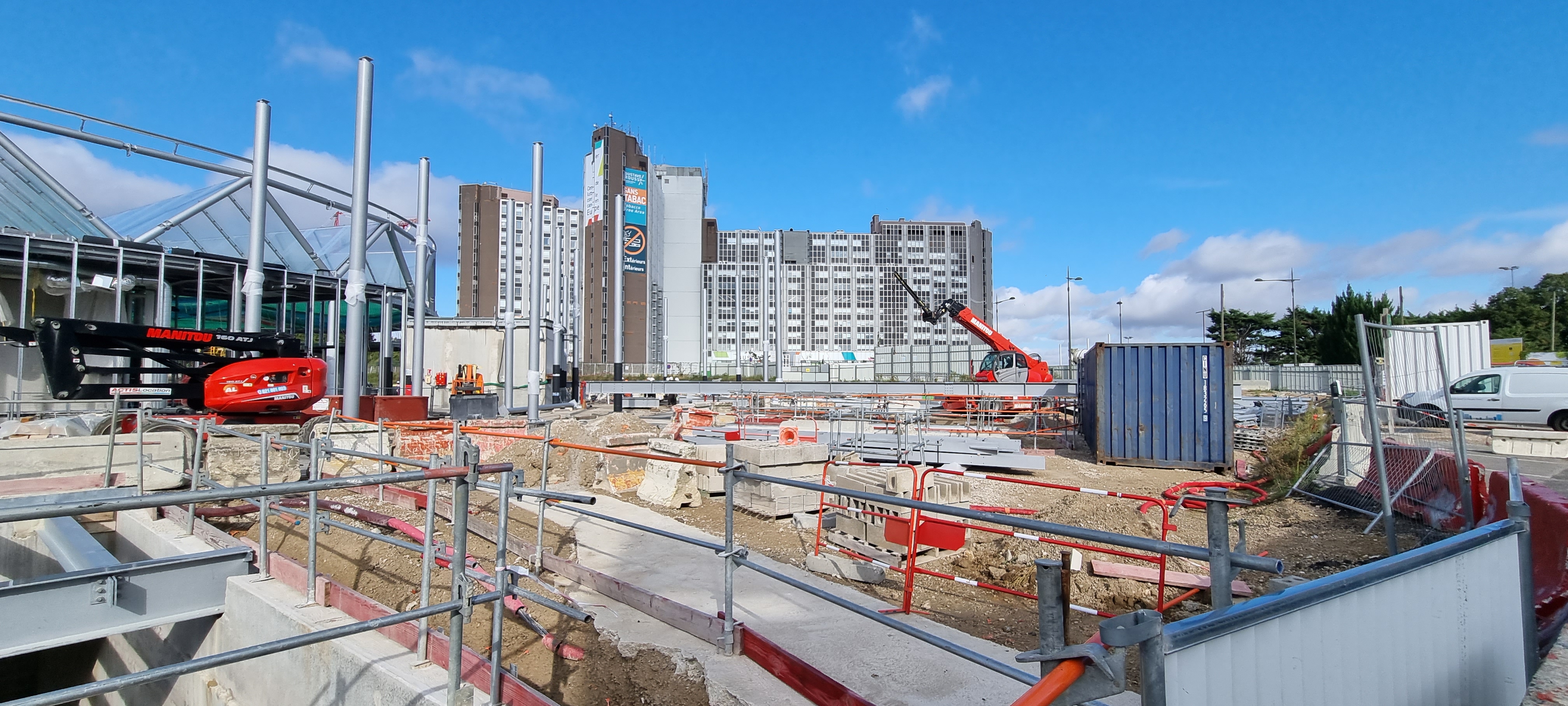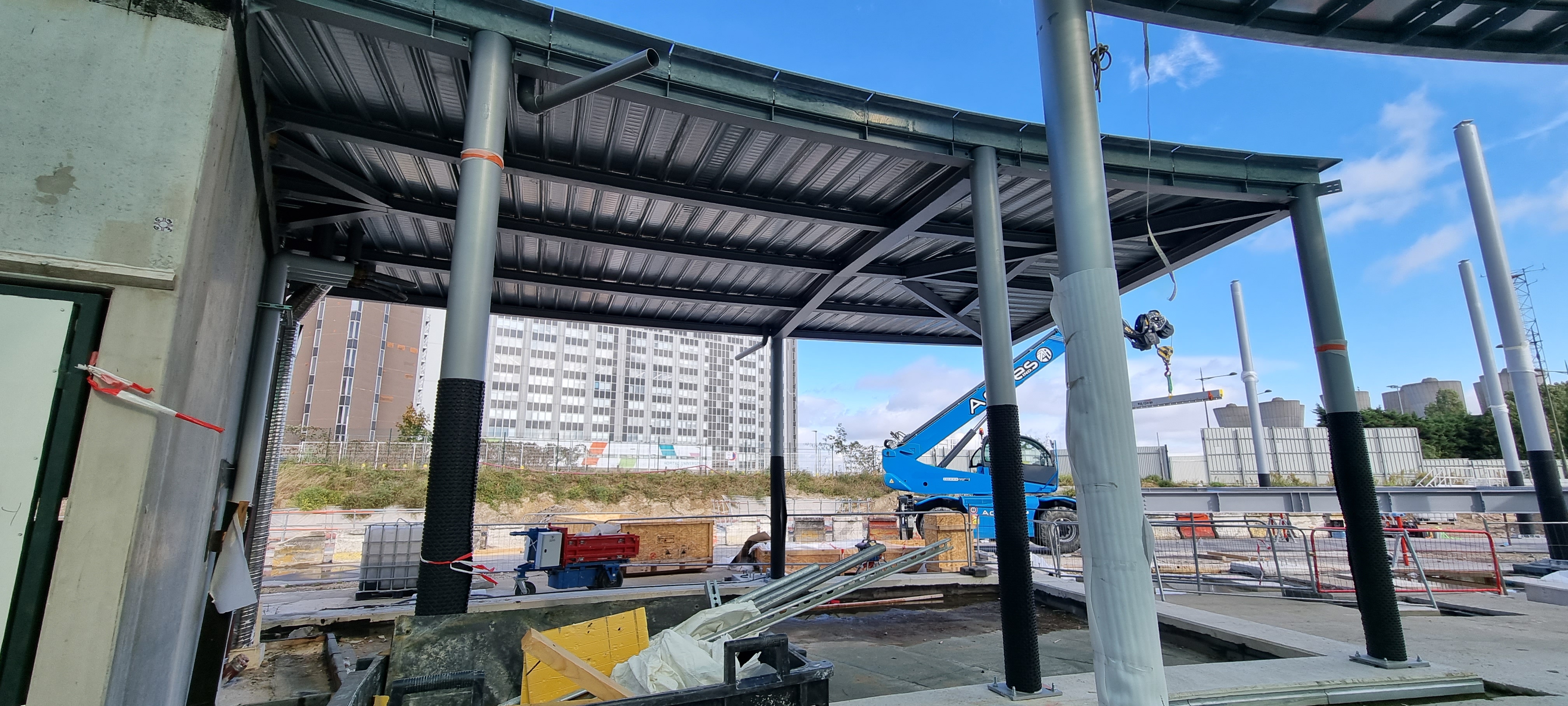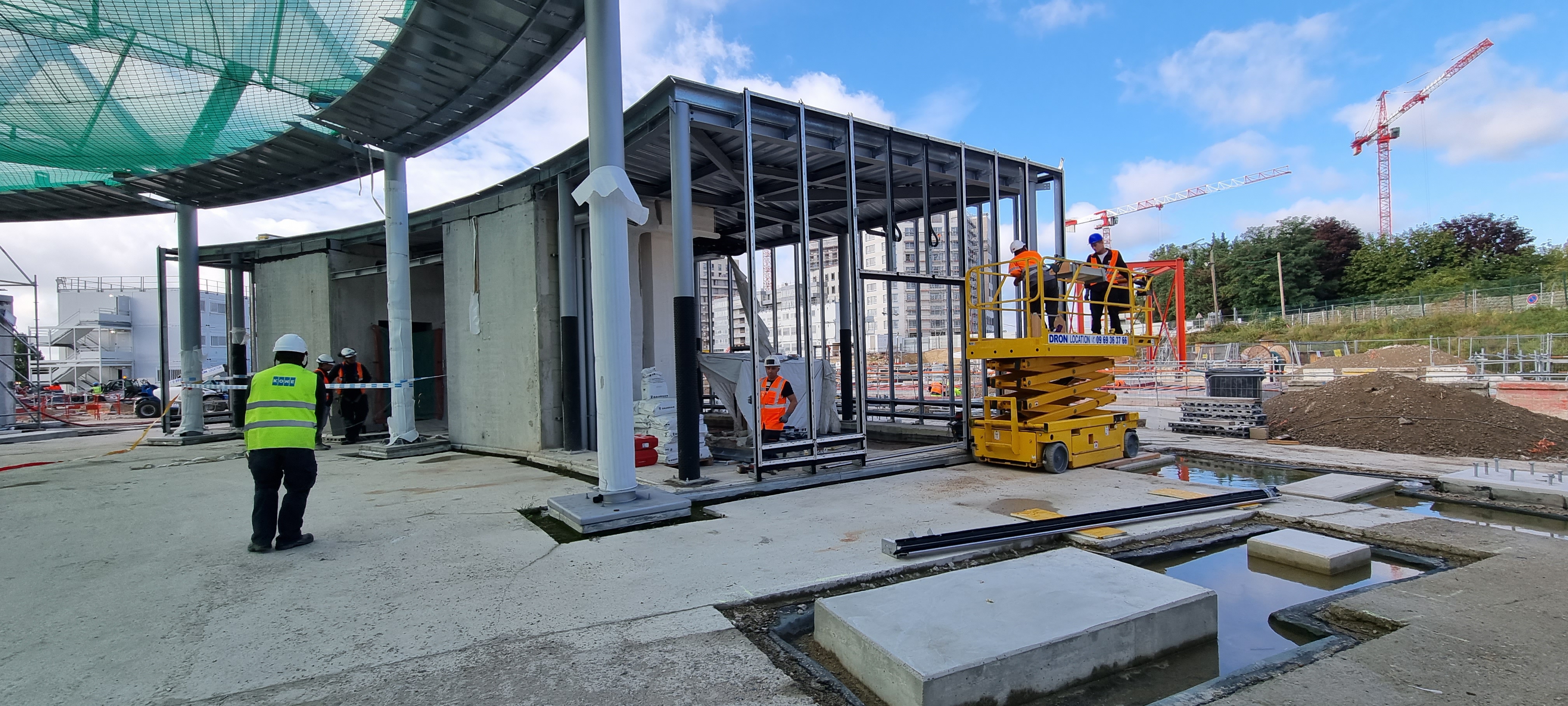 Les façadiers installent déjà leurs équipements sur les édicules montés précédemment.