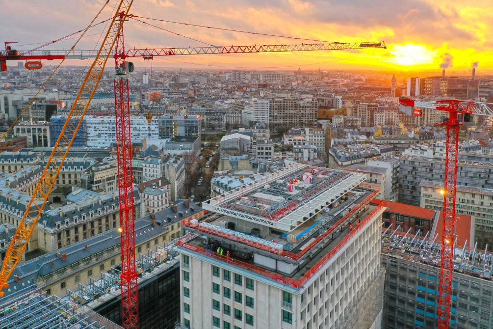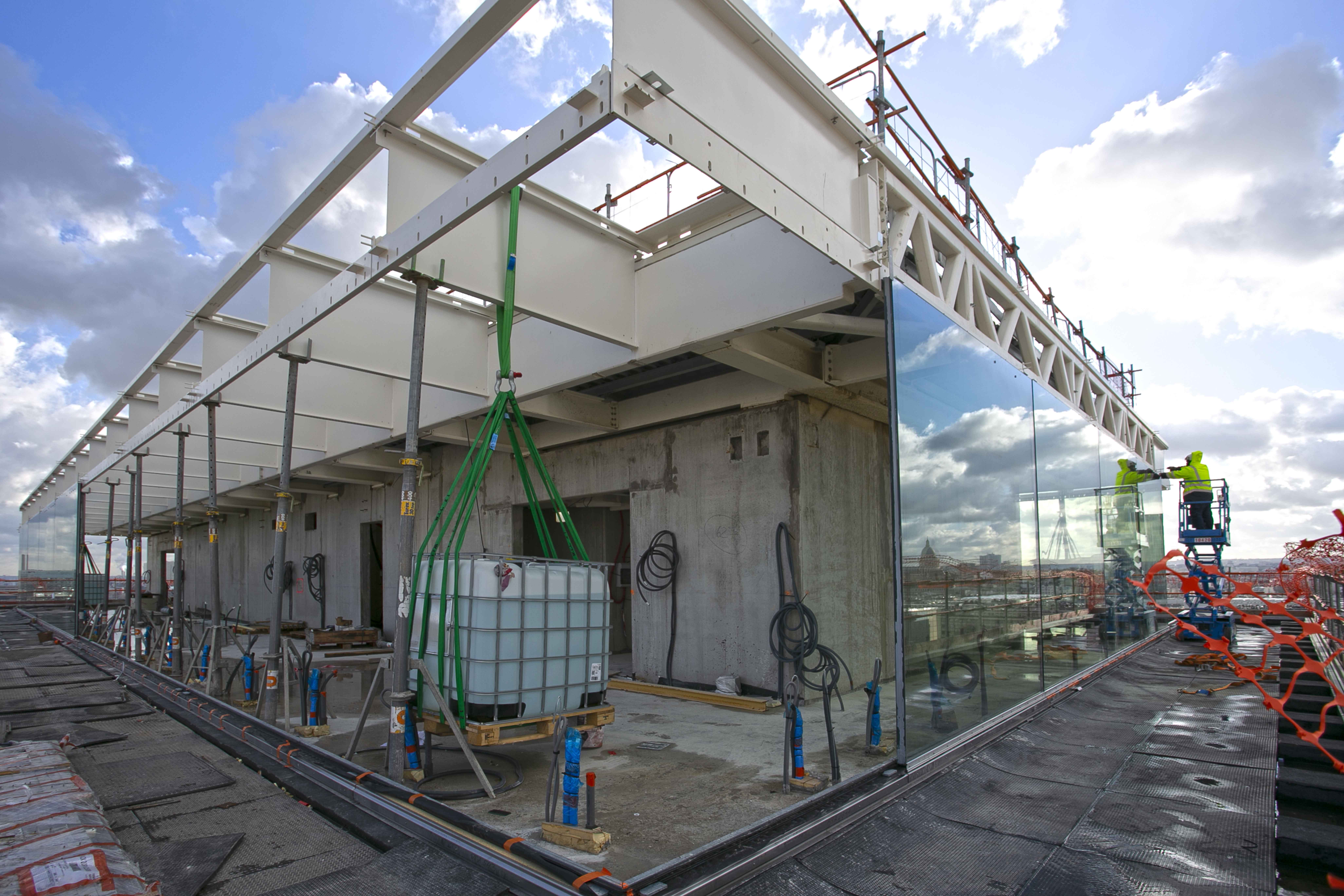 Réalisation d'agricultures urbaines, en toiture de 3 bâtiments, ainsi que de structures métalliques contre fléchées et précontraintes en vue de la pose des vitrages au R+16.