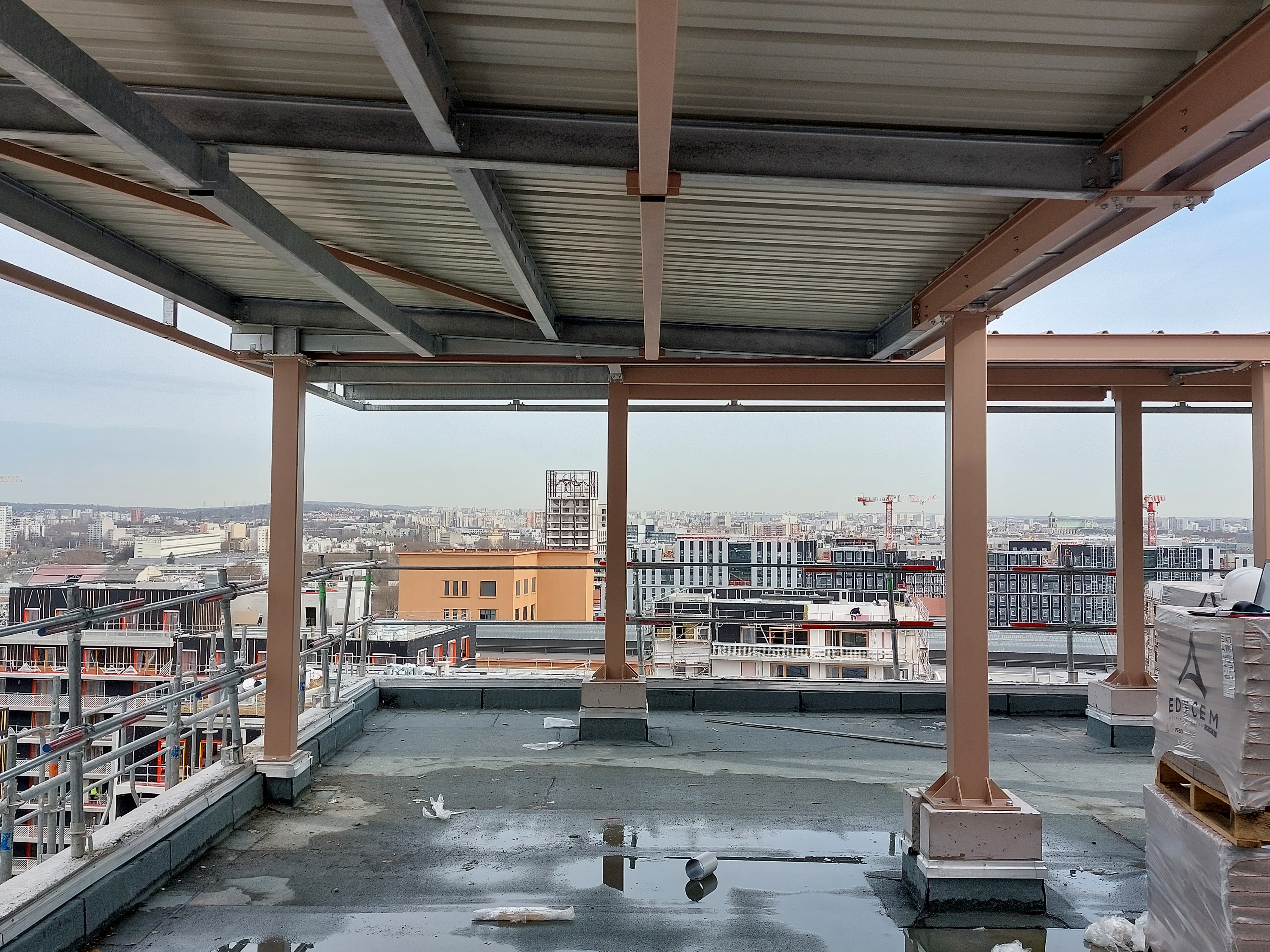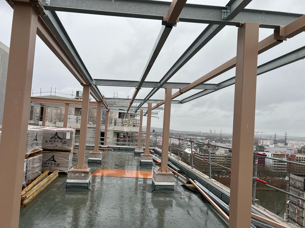 Nous avons réalisé la pose d'Ombrières en terrasse toiture sur deux bâtiments qui seront recouverts de panneaux photovoltaïques.