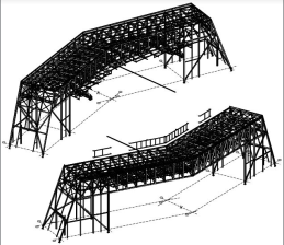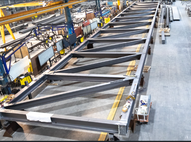 Structure en poutre treillis contre-flèchée et assemblée à blanc en atelier en pleins trous.