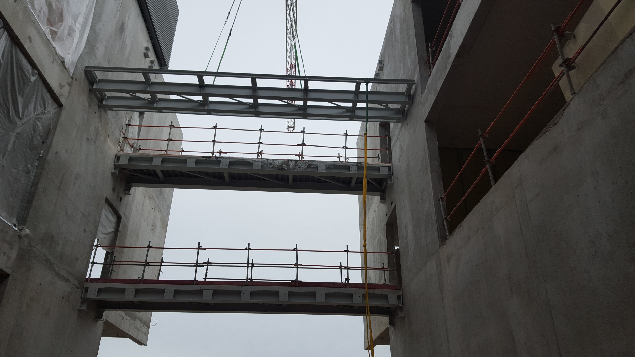 L’ensemble des passerelles ont été habillées d’une façade vitrée sur toute la hauteur. Le plancher des passerelles est constitué de prédalles.
