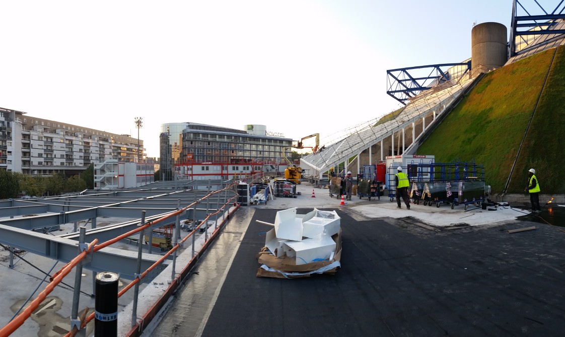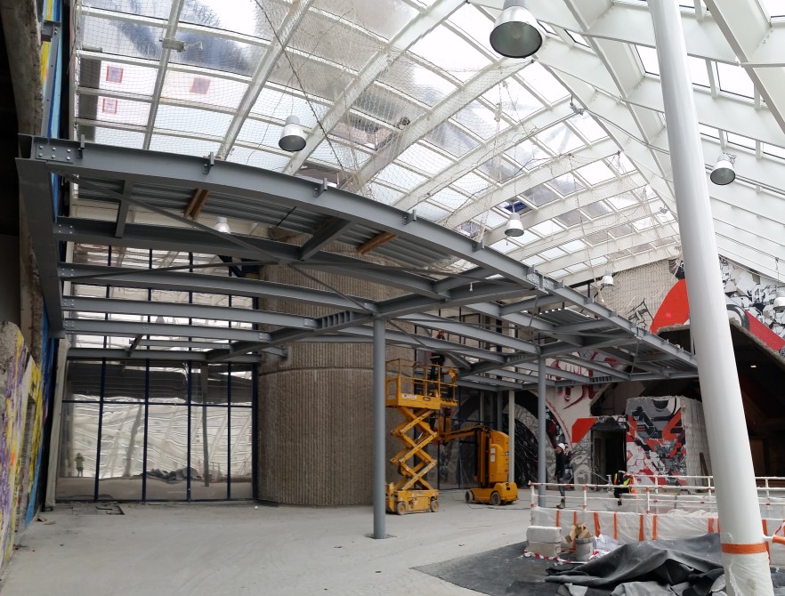 - PH R16 : Création d’une structure métallique en porte à faux de part et d’autre de la structure béton. D’un côté 6.1m de porte à faux, et de l’autre 4.25m. Cette structure supporte une toiture décorative et des éléments vitrés. Les portes à faux ont des déplacements limités à cause du vitrage de façade.